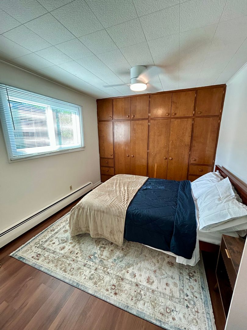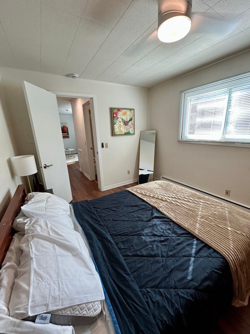 -Bedroom includes full sized bed, bedding, hangers, full length mirror.